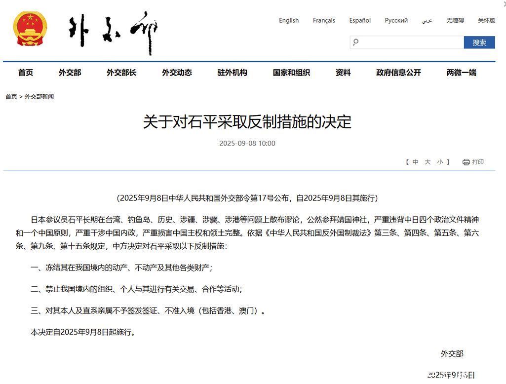 裁。按酬酢部网站的说法,对日本盘问员石平实行制裁。包括冻结其在华一齐财产、辞让中国境内任何组织个东谈主与其进行任何走动、间隔其本东谈主颠倒嫡派支属入境。通盘这个词制裁行动莫得预警、莫得粗率空间,中方这一次奏凯亮出法律与酬酢重拳。