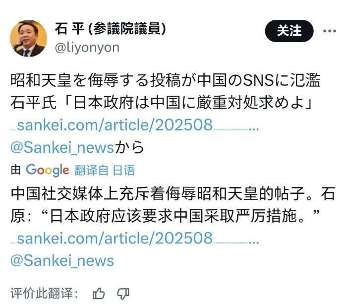 本年的2月份,石平被日本右翼政党“维新会”看中,试图将之拉入政坛,加以运用。但搞笑的是,因为“维新会”这个政党的旌旗主如果日本的民粹主见、排外心思,这就导致石平这个东谈主刚出面,就遭到大范围攻击、玷污,以为他哪怕入籍了也不是日本东谈主,以致条件其回中国。直到本年7月20日,在“维新会”的挑升操作之下,石平才终于当上了日本盘问员。之后,石平变本加厉的抹黑、非难中国。本年8月,中国网民用ai作念了一些日本二战时间裕仁天皇给麦克阿瑟“当狗”的视频,日本网民一开动没啥反映。“五星天皇”在日本干的什么事情,日本东谈主我方心里了了。截至石平开动急上眉梢,在多家日媒束缚发表著作,训斥中国网民“反日”。
