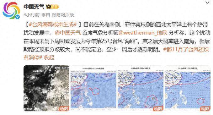 现在在关岛南侧、菲律宾东侧的西北太平洋上有个热带扰动发展中。据@中国天气首席餍足分析师@weatherman_信欣 分析称,这个扰动在本周末到下周初或发展为本年第25号台风“海鸥”。其之后粗略率插足南海,但后期旅途预告不对较大,尚不成定论,至少一周后才冉冉恢弘。