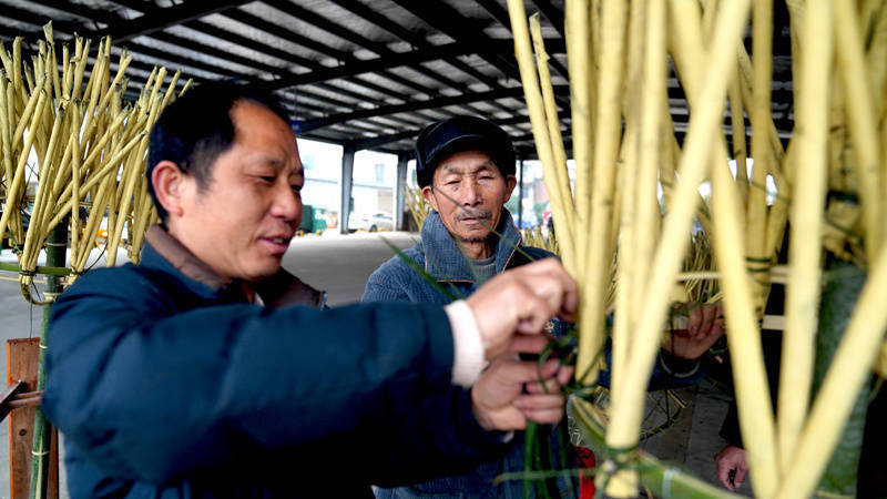 责任主谈主员尽心扎制“火老虎”灯骨架。