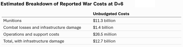 好意思国智库“政策与海外有筹商中心”(CSIS)指出,据《纽约时报》所称,这一数字“似乎只筹划了行动中未列入预算的开支”,并不包括“第一波打击前军事硬件和东谈主员聚积”的庞杂用度,也不包括诞生受损设施,或更换战损装备的估值。