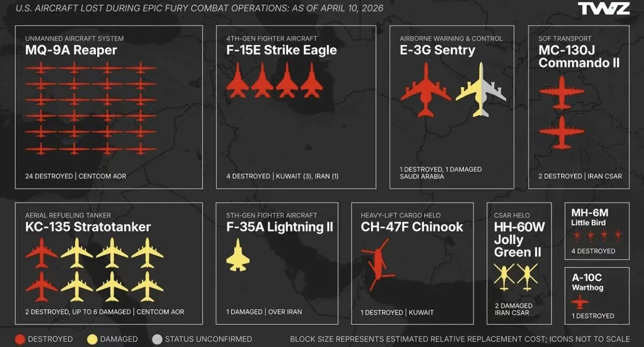 “战区”网站保守统计的好意思军飞机亏空,截止4月10日,有些据称基地内的亏空未计入