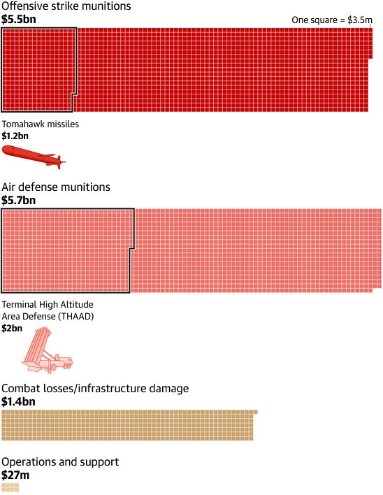 CSIS的分析,是阐述当下价钱倒推113亿好意思元的弹药组成,等于默许五角大楼亦然按新价钱筹划的。例如《卫报》制作的图表里说,六天内,用于约束的防空导弹支拨高达57亿好意思元,便是CSIS倒算出来的。