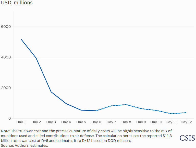 但按CSIS估算,到第12天时,行动的总成本依然升至165亿好意思元,“包括预算表里的作战开支和损害”。